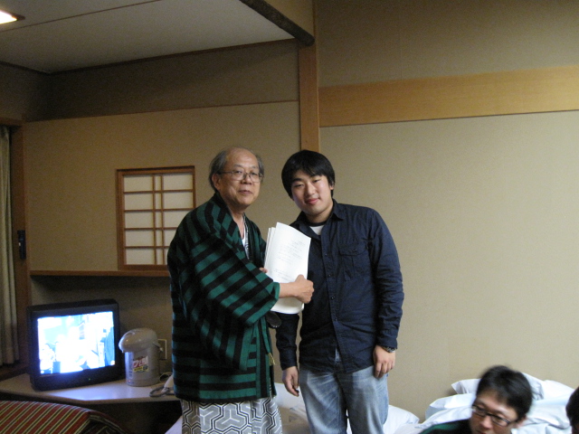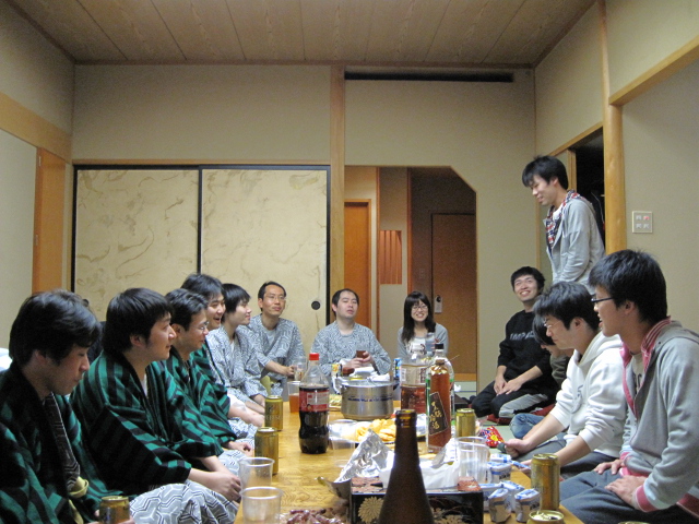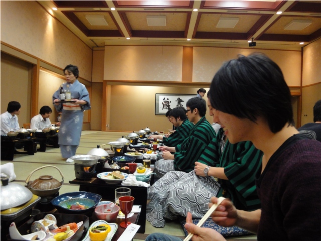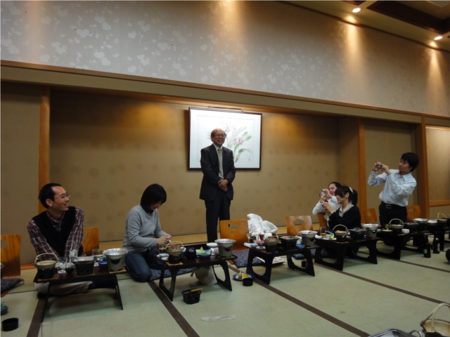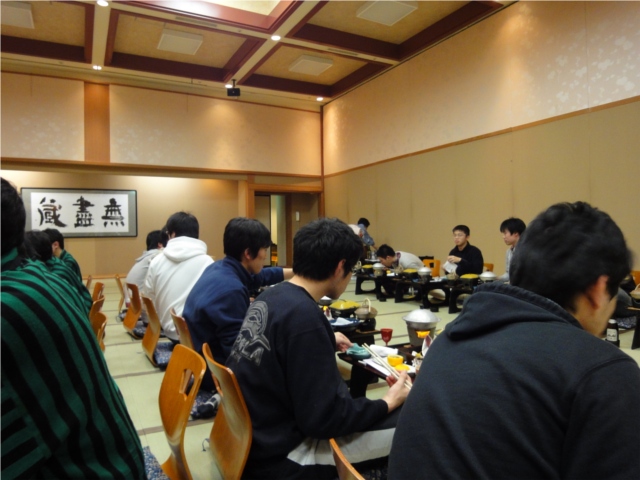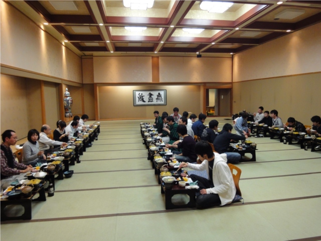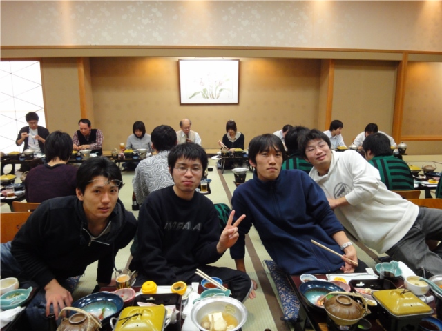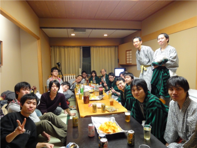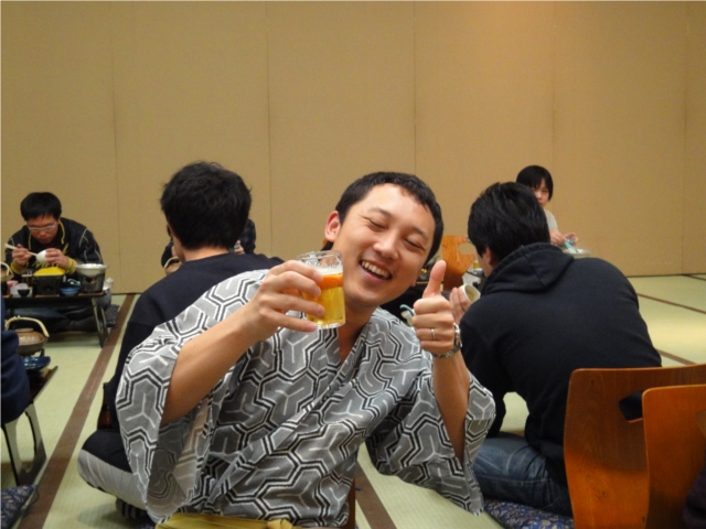 | 大役を終えビールが美味しい田中先生 | 勿論学生も撮ってます | 宴会場が広く、とても豪華 |