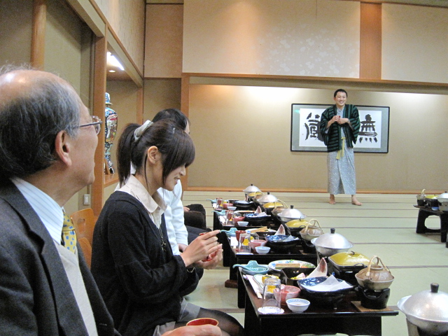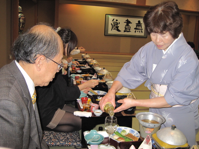 | まだ無人の宴会場 | 乾杯の音頭:田中先生 | 仲居さんからワインのサービス |