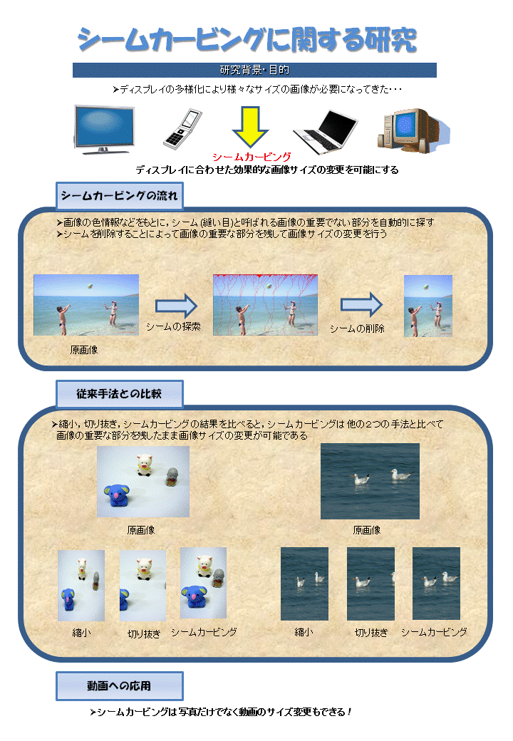 下のポスターに,従来手法とシームカービングの処理結果の比較を示した.従来手法では,処理後にオブジェクトの形状に歪みが生じてしまっているが,シームカービングでは,オブジェクトの形状を維持したままのサイズ変更に成功している.
