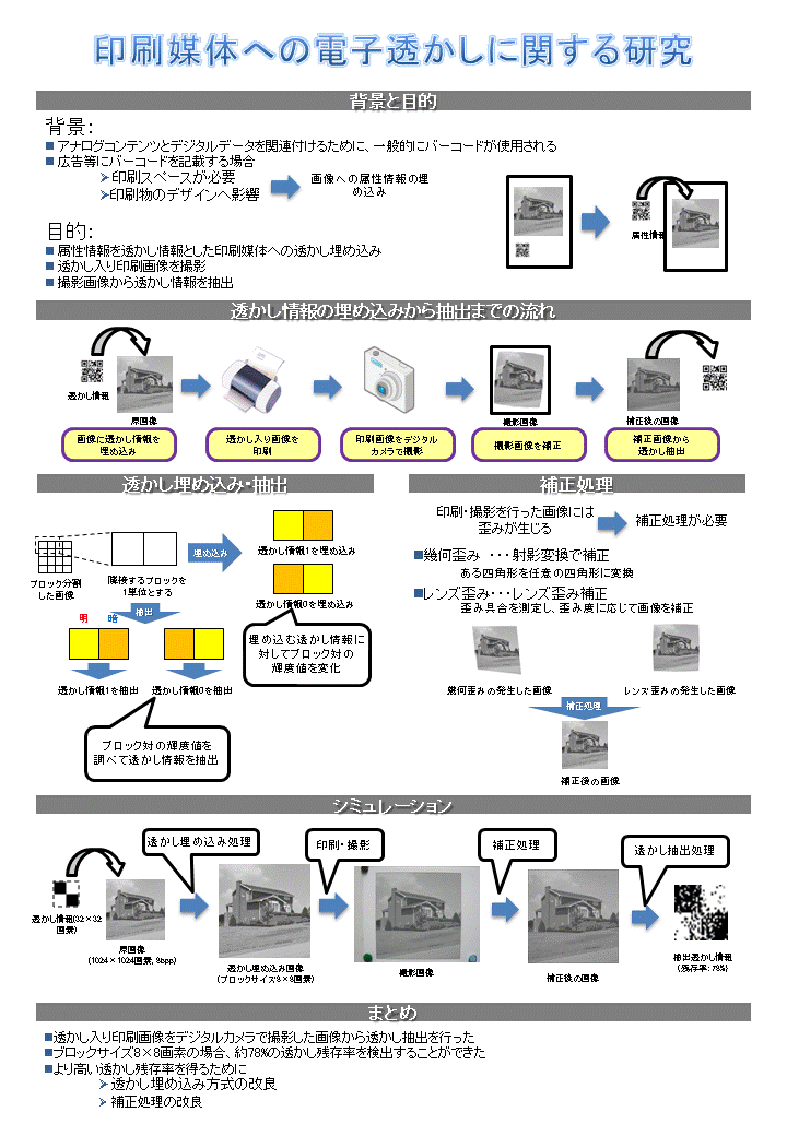 電子透かしとは,デジタルコンテンツの画像などに目に見えない形で情報を埋め込む技術のことである.電子透かしを用いることで著作権を持つ画像においては著作権の主張をすることが可能となり,風景などを撮影した画像においては撮影日時や撮影者などの情報を画像に保存することが可能となる. しかし,これらは全てデジタルコンテンツにおける利用である.アナログコンテンツにおいて付加情報を関連付ける際には,QRコードやバーコードが広く利用されている.これらの技術は,印刷スペースを必要とすることや印刷物そのものへのデザインの影響を考慮しなければいけないという問題点がある.この問題点を解決するために,アナログコンテンツに電子透かしを埋め込む技術の要望が高まっている. 本研究室では,アナログコンテンツの1つとして印刷媒体に電子透かしを埋め込むことを目的に研究を行っている.