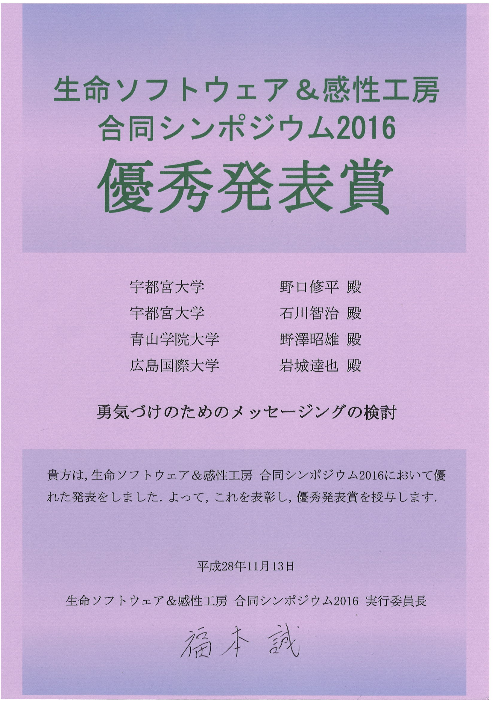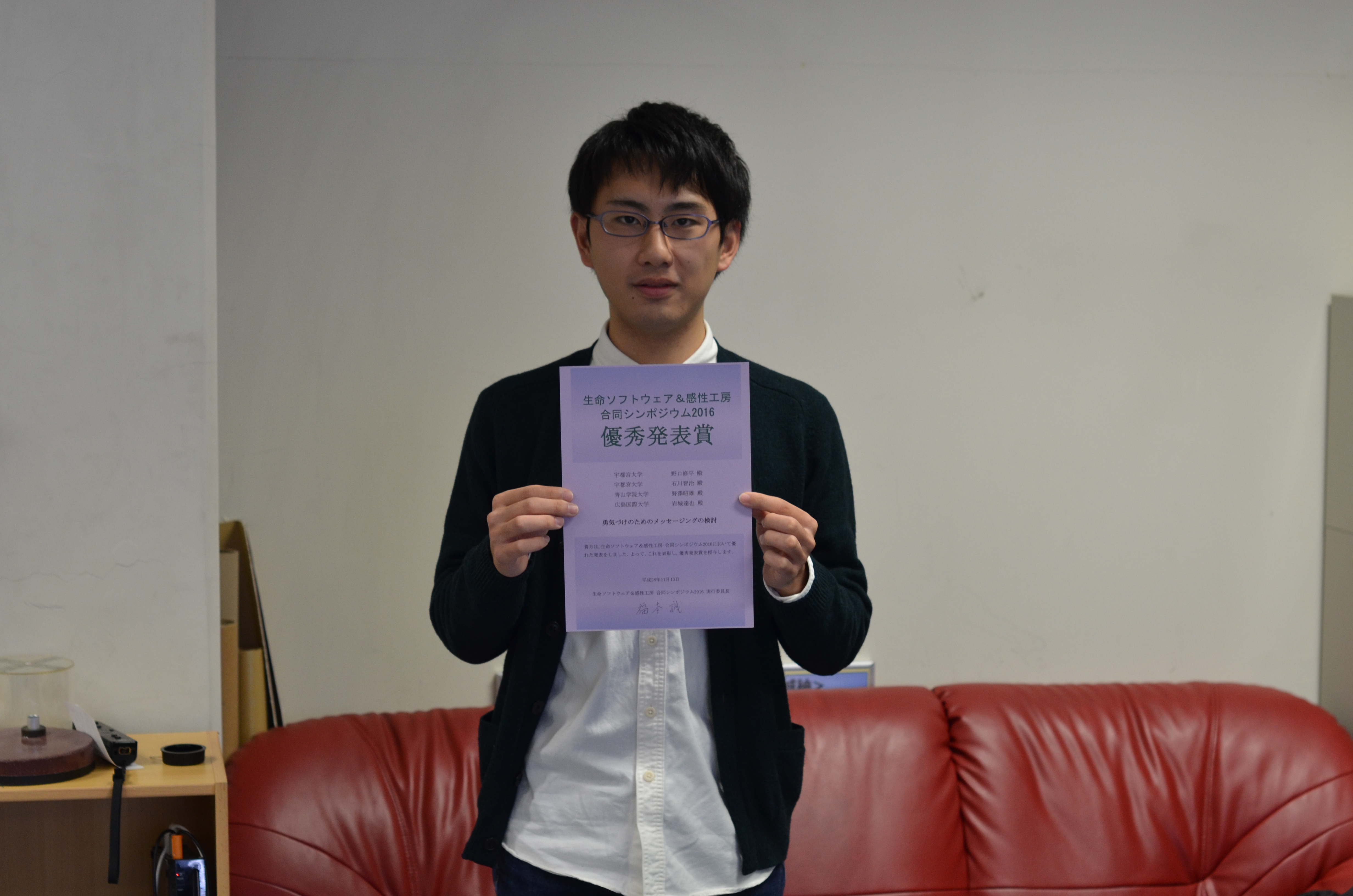 この度は,「生命ソフトウェア&感性工房合同シンポジウム2016」において優秀発表賞を受賞することができ光栄に思います.受賞につきまして,ご指導頂いた石川智治先生,青山学院大学の野澤昭雄先生,広島国際大学の岩城達也先生,研究室の皆様に心より感謝申し上げます.今後もこの受賞に恥じぬように日々の研究に尽力していきたいと思います.